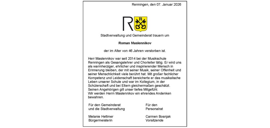 Für das Kollegium und die Gemeinschaft der Musikschule ist dieser unerwartete Verlust sehr schmerzlich. Herr Maslennikov war ein wunderbarer und sehr geschätzter Kollege und Lehrer, der sich mit viel Engagement über seine Schülerinnen und Schüler hinaus für die Musikschule